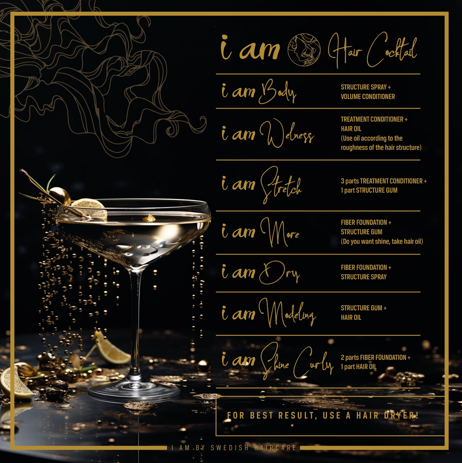 Hair Cocktails are our way of simplifying styling without limiting creativity. By mixing two or more products from "I am by Swedish Haircare" you can create your own, tailor-made products for your hair and style.